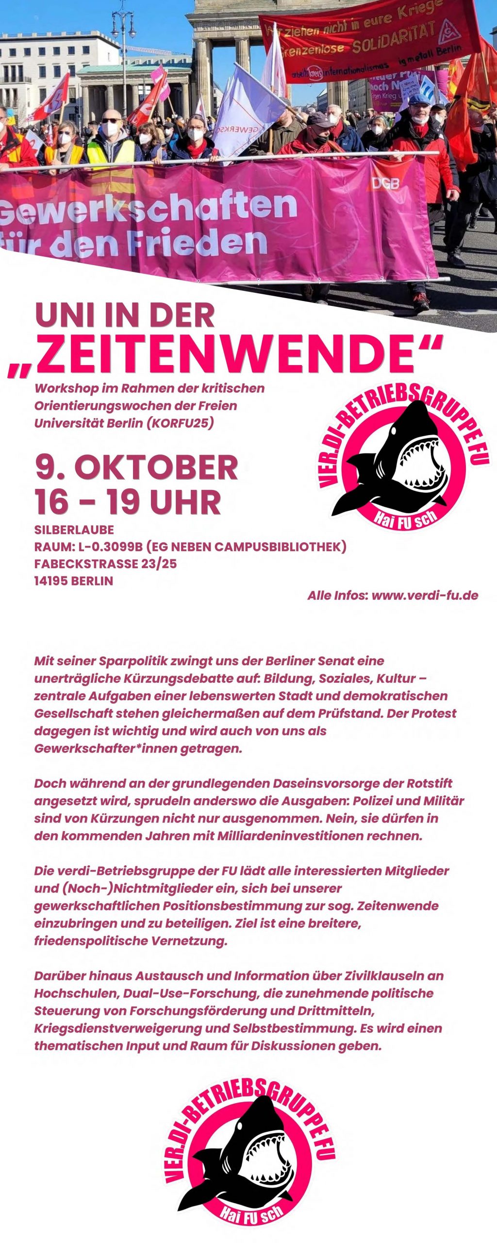 Die verdi-Betriebsgruppe der FU lädt alle interessierten Mitglieder und (Noch-)Nichtmitglieder ein, sich bei unserer gewerkschaftlichen Positionsbestimmung zur sog. Zeitenwende einzubringen und zu beteiligen. Ziel ist eine breitere, friedenspolitische Vernetzung. Darüber hinaus Austausch und Information über Zivilklauseln an Hochschulen, Dual-Use-Forschung, die zunehmende politische Steuerung von Forschungsförderung und Drittmitteln, Kriegsdienstverweigerung und Selbstbestimmung. Es wird einen thematischen Input und Raum für Diskussionen geben.